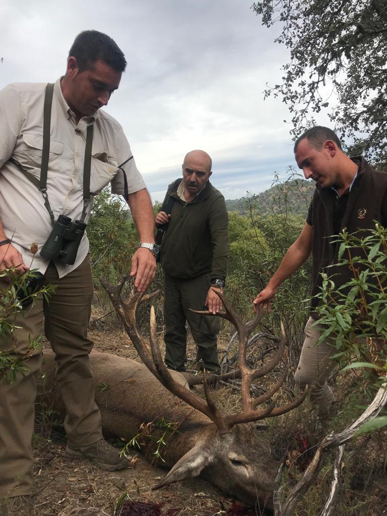 La tensión se cortaba presagiando el ansiado desenlace mientras sus bramidos se escuchaban más y más fuerte, y por fin ahí estaba, su majestuosa silueta dibujaba el horizonte, mientras intentaba colocar la cruz en el sitio y aguantar la respiración a la misma vez, pues no dejaría mucha opción de lance este veterano del monte, y todo paso en un segundo, tira!!, me dijo Jesús con voz rotunda, y eso hice, descargando en este mismo instante toda la tensión acumulada durante este tiempo, y consiguiendo colocar un certero disparo con el que no pudo aguantar caminando más de 30 metros, y calló. Abrazos y enhorabuenas se repetían hasta que llegamos al lugar donde yacía el maravilloso ciervo que había dado caza, en su propio territorio y con un rececho como mandan los cánones. No quiero dejar pasar la ocasión para agradecer a Jesús Jiménez de Venatoria Safaris y a la guardería por la magnífica organización en estos dos dias de caza, y por supuesto, a mi gran amigo Carlos y Jose por acompañarme en esta emocionante experiencia.