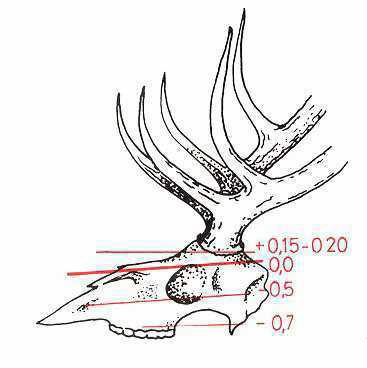 Medida por la cara anteroinferior, desde la bisectriz que divide el ángulo formado por este candil con la cuerna hasta el extremo de la punta central. Si la punta central se divide en una horquilla, se mide hasta la punta más larga.